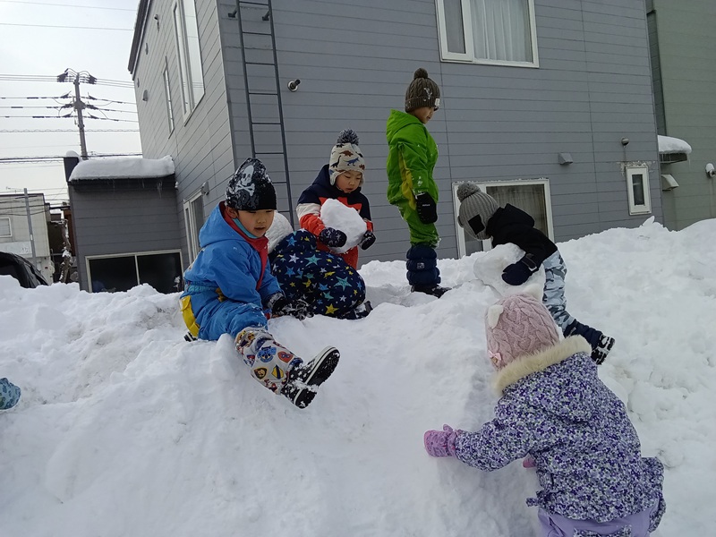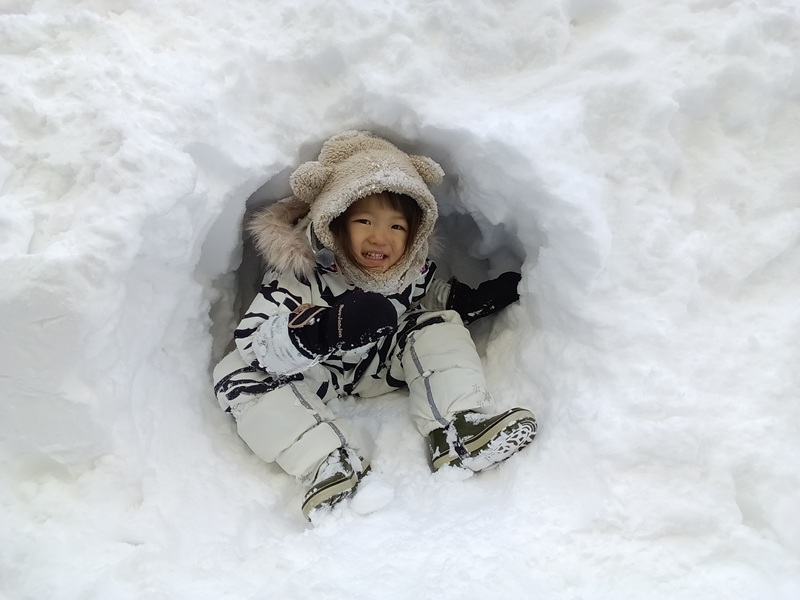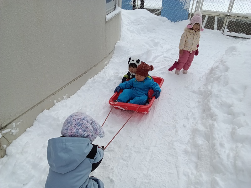 つぼみちゃんは、ミニ園庭で雪あそびをしています。大きな穴をみんなで掘ってかまくらを作りました。一人ずつ入ることができるお気に入りの場所です。他にも大きなそりにお友達を乗せて引いたり、雪の上だと力持ちになった気分ですね。みんなで頬を赤くして楽しんでいます。 |