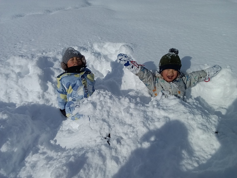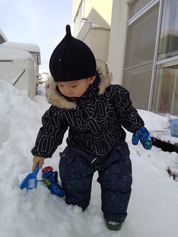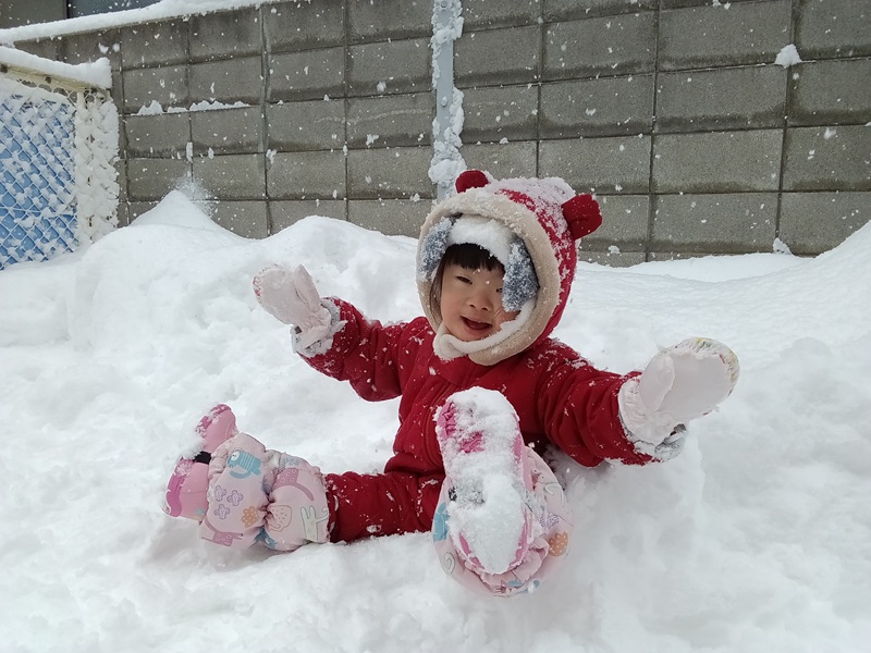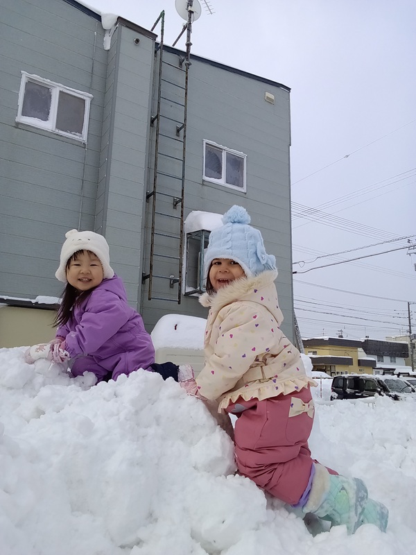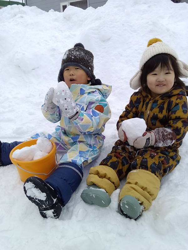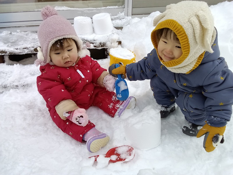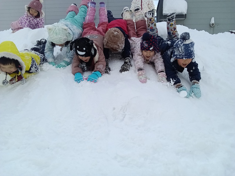 今年はくるみちゃんも、園庭の雪山で遊んでいますよ。デコボコした雪山を登るだけで、ハーハー息が切れるほどです。お友達と一緒のお尻滑りも楽しんでますよ。お部屋でままごと遊びが好きなくるみちゃんは、雪でのお料理も大好きですよ! |