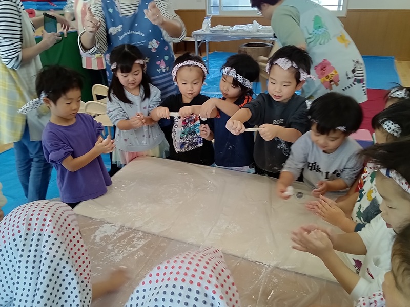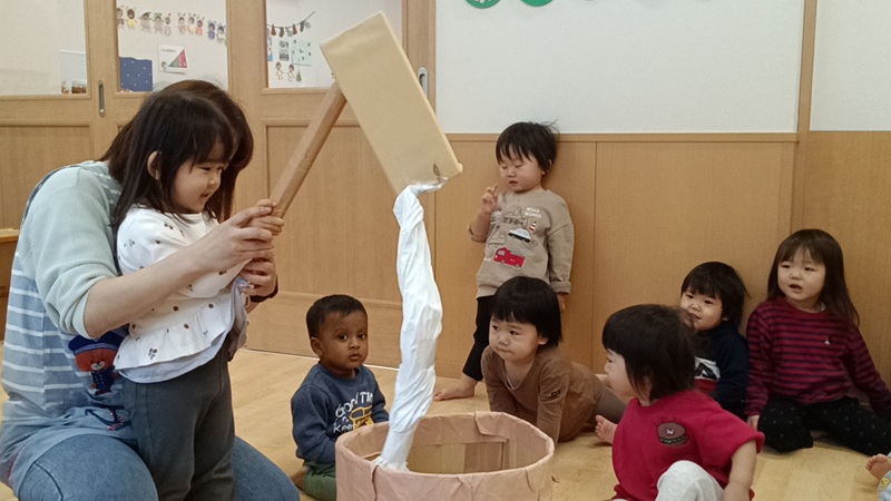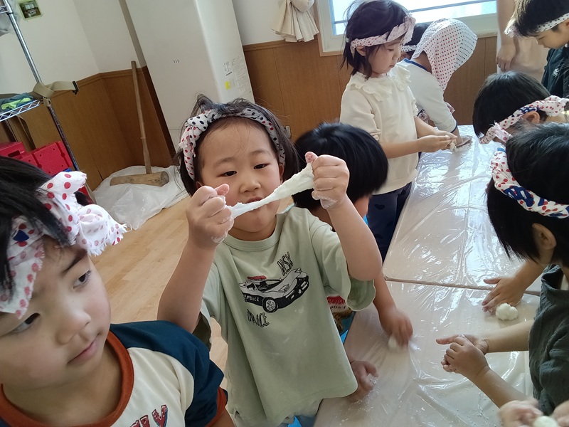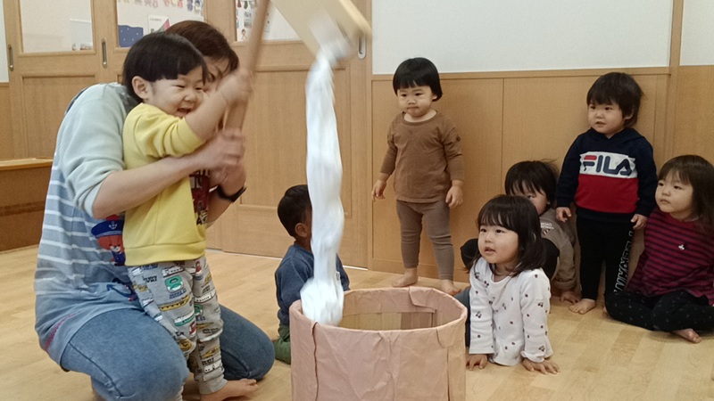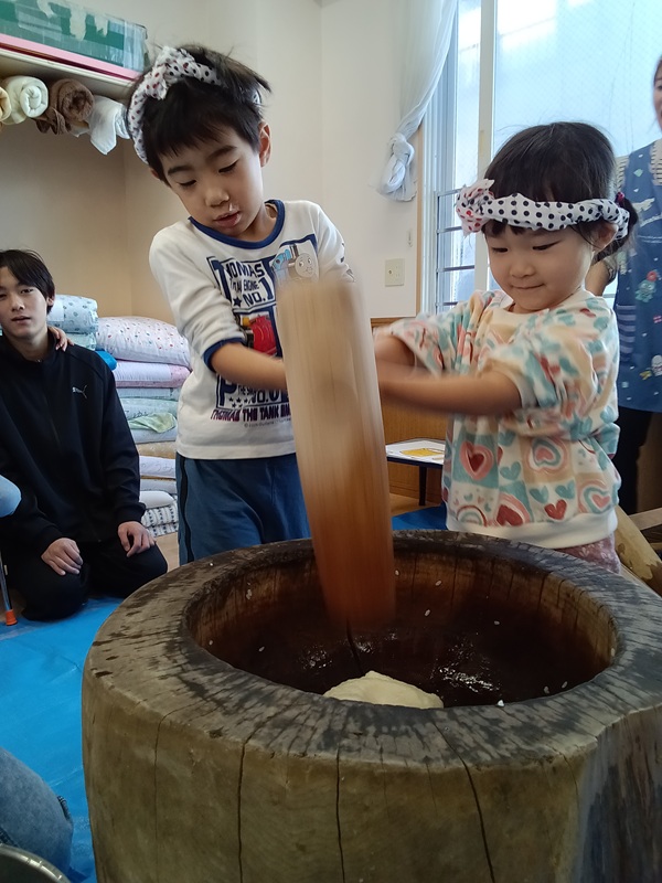 ひまわりさんの餅つきを見学した後に、各クラスで、お餅つきごっこをしました。つぼみちゃんは保育士と一緒に手作りの杵と臼でぺったんぺったん。お餅が伸びると「わー」と歓声が上がるほどでしたよ。くるみちゃんは、一人でひまわりさんのように、お餅つきごっこを楽しみました。来年は、本物のお餅つきがんばるぞー!! |