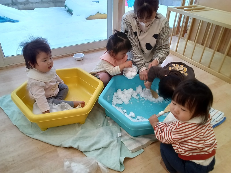 一足先にもも組では、お部屋で雪あそびをしました。たらいに雪を集めて、スプーンやコップですくったり、 |