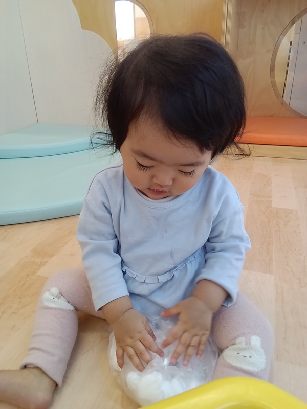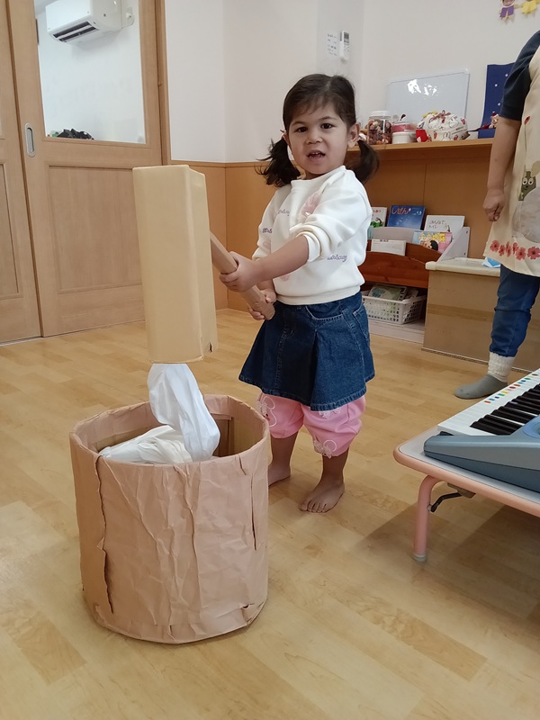 鏡の前にじっくり座って、まるでお母さんのように綺麗にお化粧したり、お人形を使って、メイクしたり、なりきっている姿がとてもかわいいです。ブロックで作っていると、大きい子たちの太鼓の練習のように、真似て叩いたりしています。身の回りで見ていることなどが、遊びの幅を広げているようですね。 |