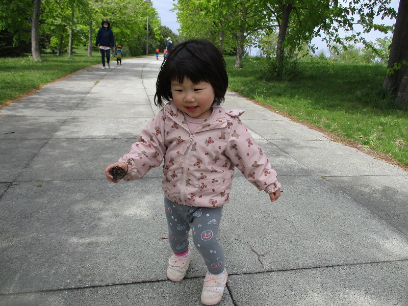 お外遊びが大好きな子供たちです。「お散歩行こうね。」と声をかけると、準備も自分で頑張る姿が見られていますよ。お友達の帽子や靴下を覚えて持っていってあげる姿もあります。お散歩では松ぼっくりが沢山落ちている水郷北大橋の方まで交代で歩きながら遊びに行くこともありました。松ぼっくりや虫を見つけて見せに来てくれていますよ。 |
